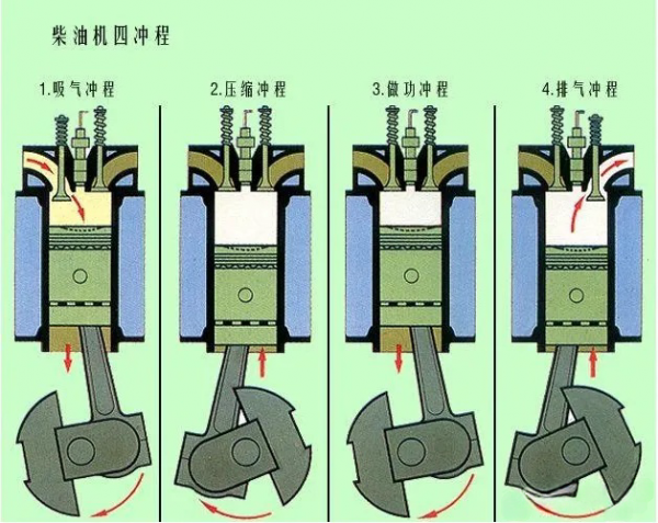 在這里,我們主要介紹四沖程柴油機的工作過程。四沖程柴油機的四個沖程為一個周期,以此類推,循環(huán)往復的進行工作。